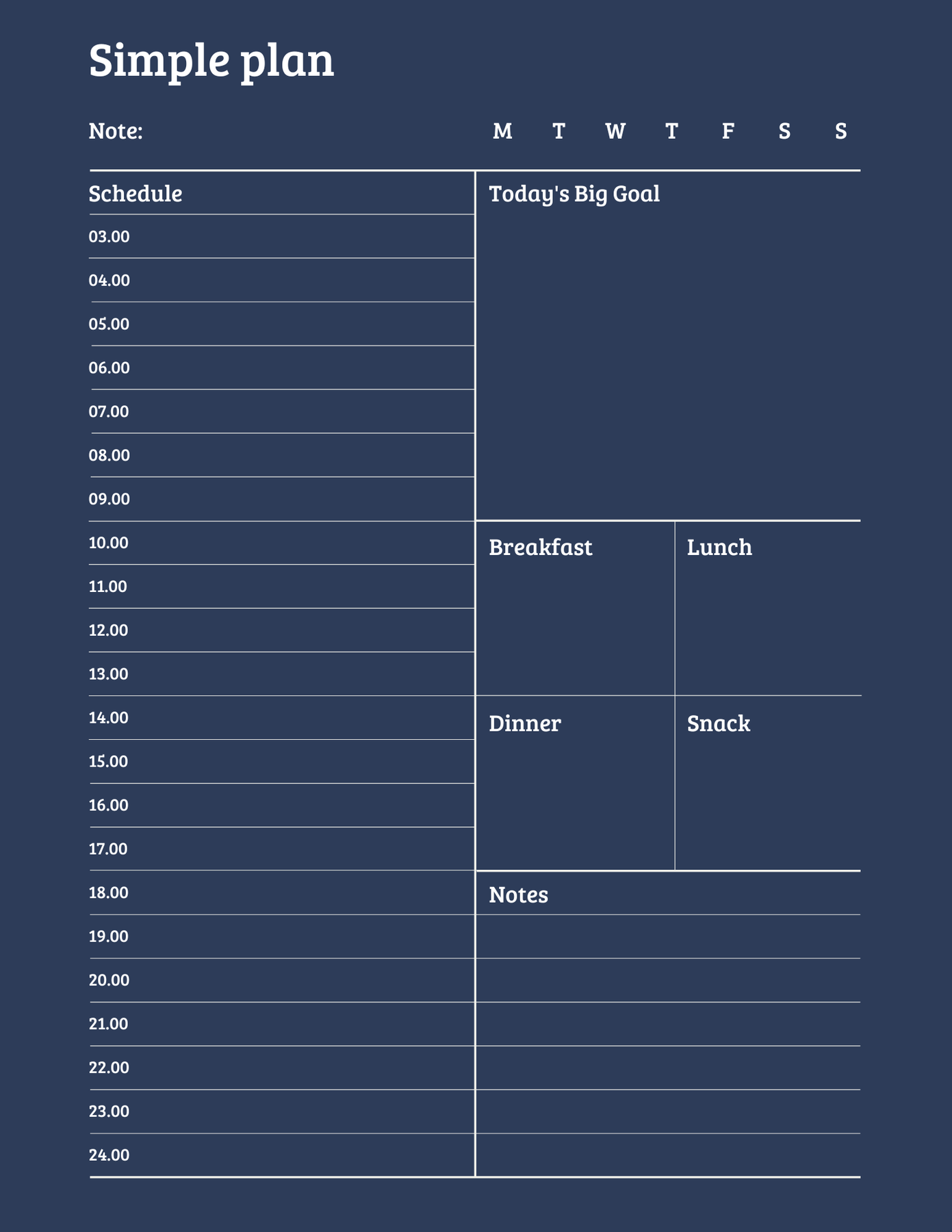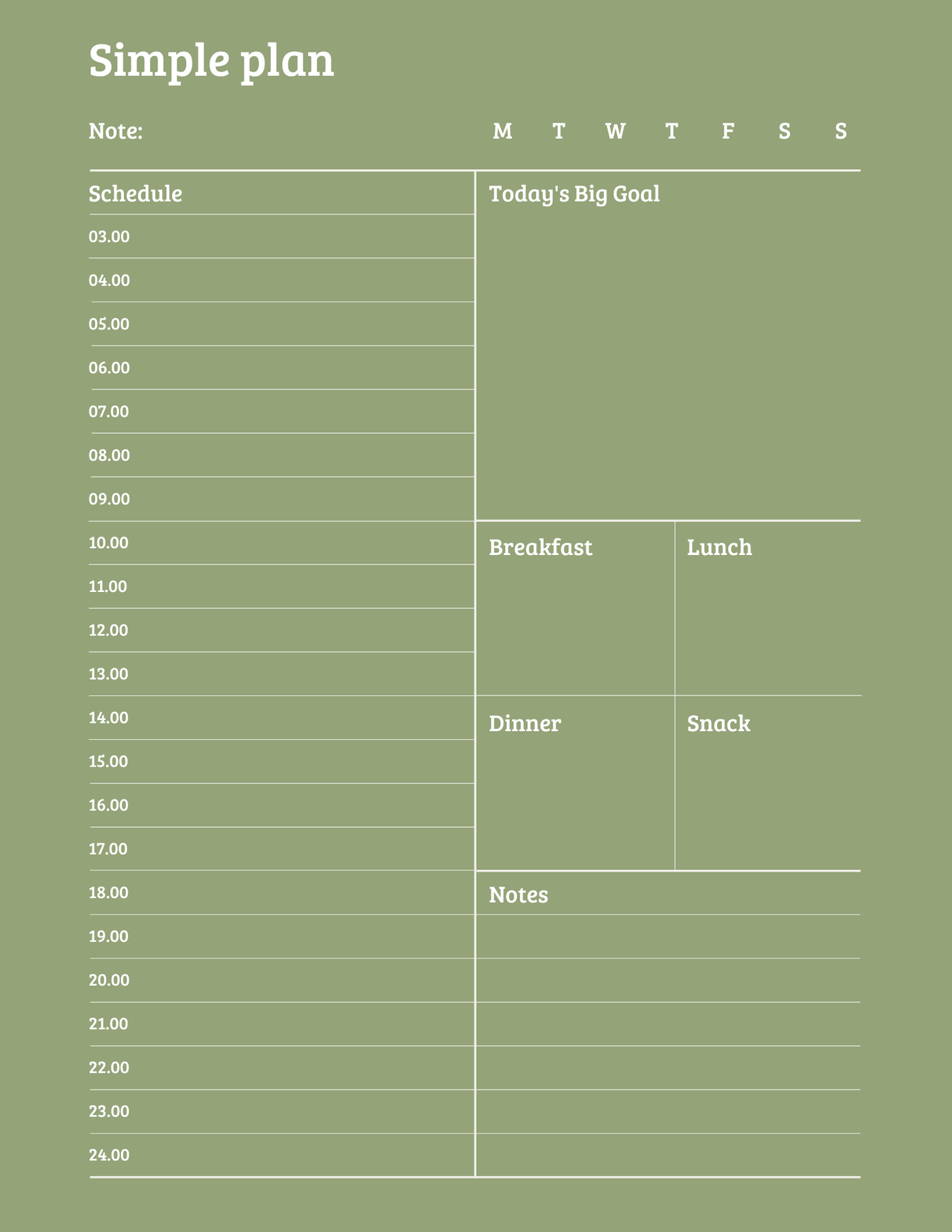 Simple Plan is a minimal, structured daily planner designed to help you manage your time clearly from morning to night. With an hour-by-hour schedule, space for your main goal, meals, and notes, it keeps your entire day organized on one elegant page.