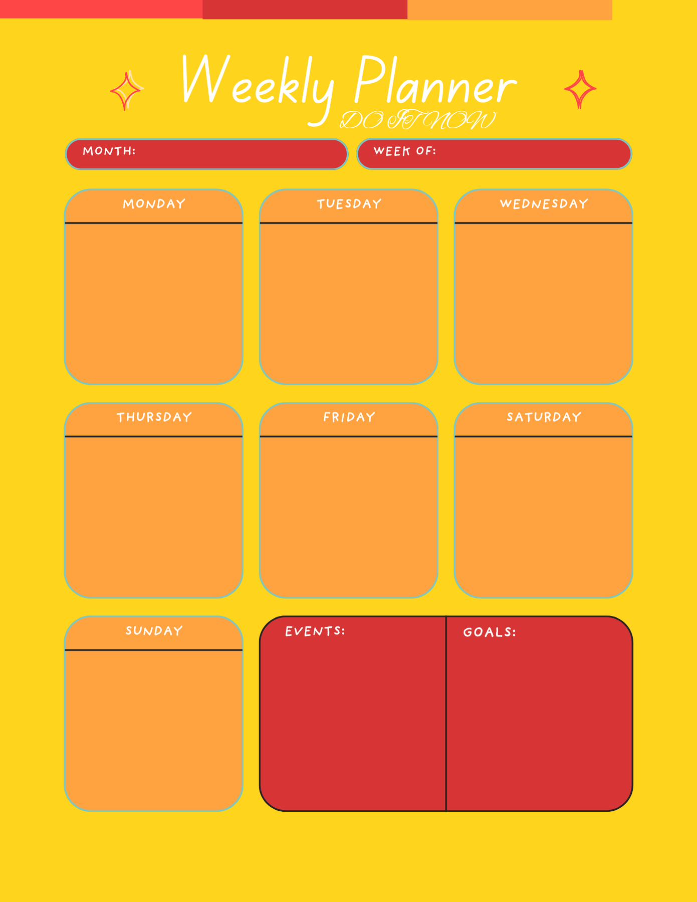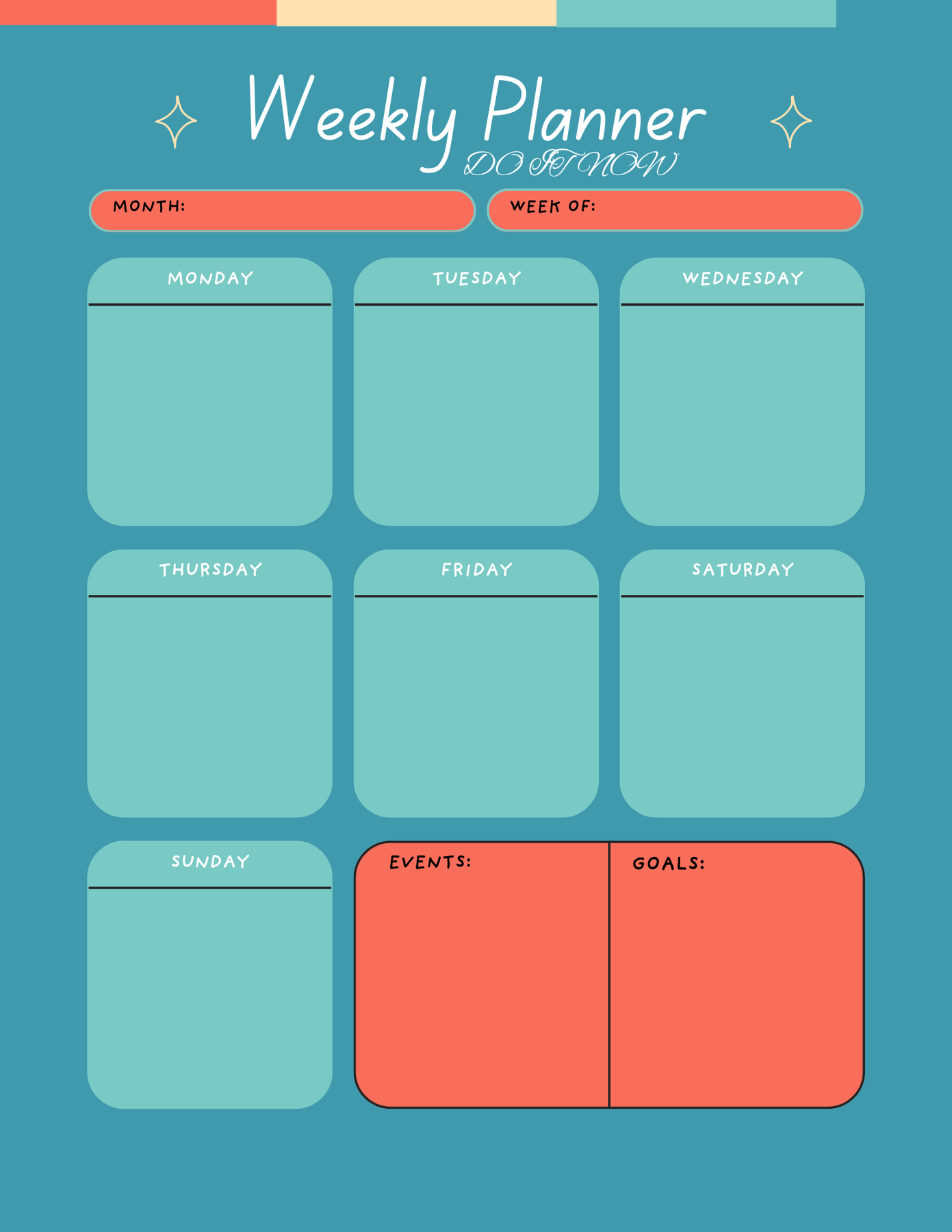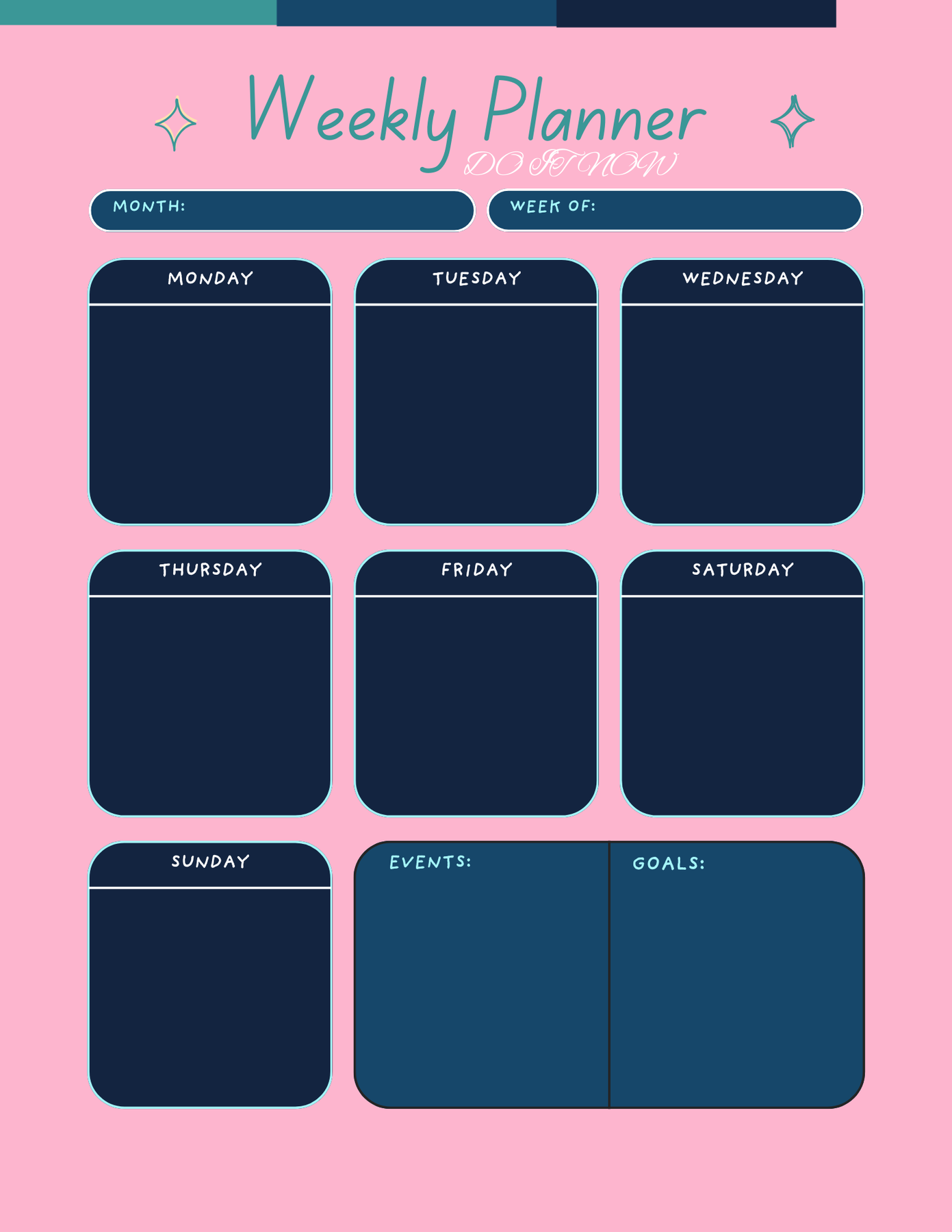 This planner gives you a clear overview of your entire week, with dedicated sections for Monday to Sunday, plus space to track your goals and important events. Its soft color palette and rounded layout make planning feel simple and enjoyable—perfect for daily productivity without overwhelm.